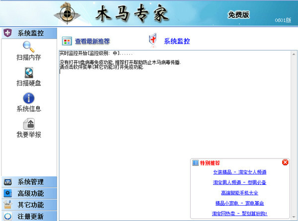 木马专家是一款木马查杀软件,软件除采用传统病毒库查杀木马以外,还能智能查杀未知木马,自动监控内存非法程序,实时查杀内存和硬盘木马。第二代查杀内核,支持脱壳分析木马.软件本身还集成了网络入侵拦截,ie修复,恶意网站拦截,系统文件修复,注册表备份和供高级用户使用的系统进程管理和启动项目管理等。