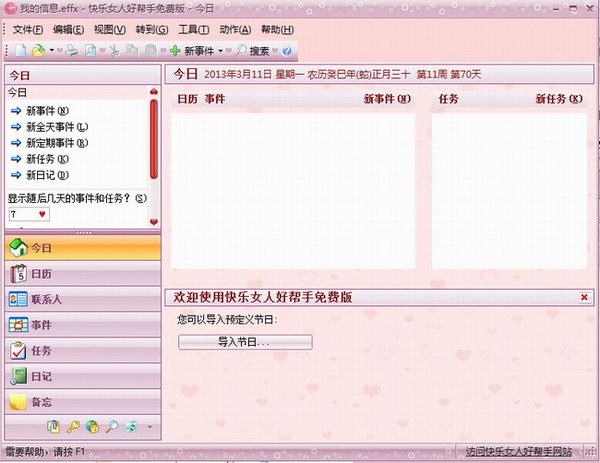 360安全之家网站提供快乐女人好帮手下载官方免费版v5.22.526官网下载安装。快乐女人好帮手是一款专门为女性用户设计的时间和联系人的信息管理软件,快乐女人好帮手拥有时尚靓丽的软件界面,一套程序即集成了通讯录,公历农历,日程安排,工作任务管理,日记本,备忘录,桌面便笺,密码管理器等诸多功能。