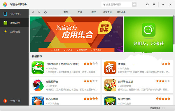 淘宝手机助手是淘宝官方推出的手机软件商店,为您提供丰富、安全、优质的安卓应用及游戏资源,同时我们也在努力打造手机网购安全保障、零流量当面传等特色功能, 为您提供个性化手机助手服务。