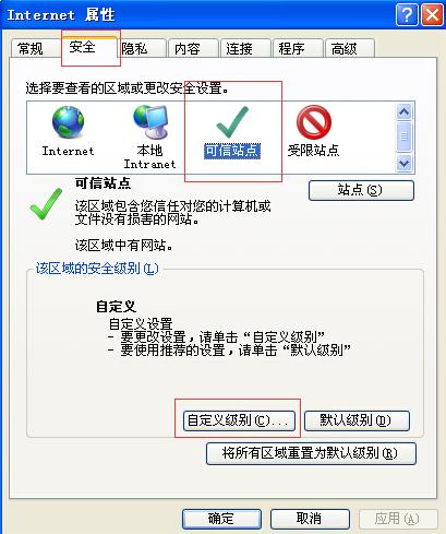 而用常规的工具-->INTERNET选项-->安全-->受信任的站点-->站点,来设置,可能也不管用,并且很麻烦。下面,小编就教你一种新方法解决这个问题。 在开始菜单—控制面板里面,打开Internet 选项,然后点击安全选项卡,选择可信站点,再选择自定义级别,如图:
